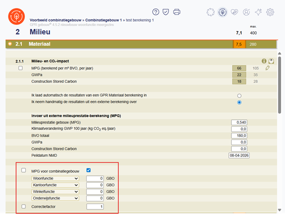 Afbeelding: Voorbeeld van de invoeroptie MPG voor combinatiegebouwen